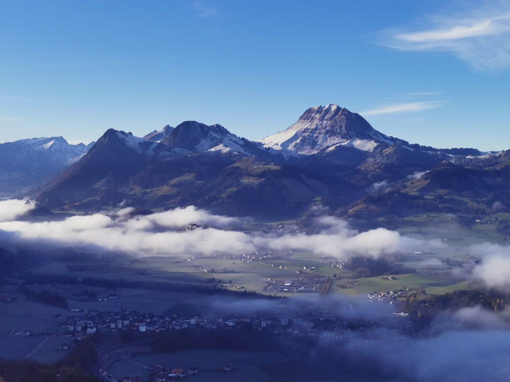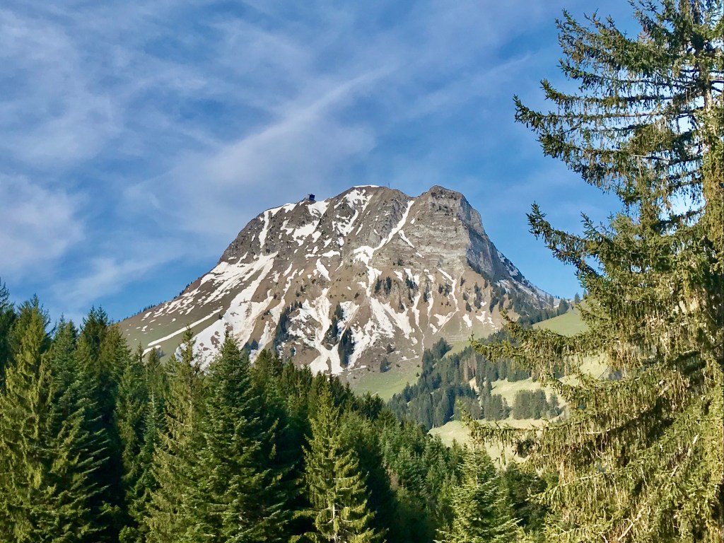 Le Moléson, la montagne mythique des Gruyèriens, le tour par les sentiers des armaillis, par les pâturages et les forêts sillonnera la vallée de l’Intyamon, puis dès le col de la Chaux le flanc de coteau du Teysachaux. Sur l’itinéraire des fromageries du Gruyère d’Alpage AOP et au cœur de la zone de création de ce fromage millénaire, toujours imité mais jamais égalé ! Juste en face, les plus hautes montagnes des Préalpes fribourgeoises : la dent de Broc, la dent du Chamois et le Bourgo ; le Vanil Noir, Vanil de l’Ecri et la pointe Paray ; un calcaire gris de la fin du jurassique en géologie vers -145 mio d’années.